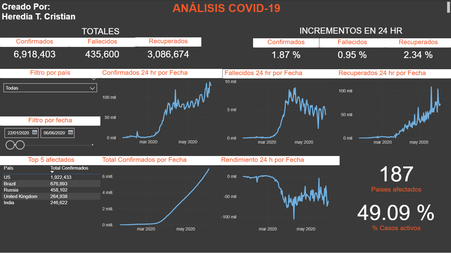 Dashboard interactivo en Power BI para el análisis de datos de COVID-19, mostrando el total de casos confirmados, fallecidos y recuperados, así como el incremento en las últimas 24 horas. El panel incluye funcionalidades de filtrado por país, permitiendo una visualización dinámica y comparativa de la evolución de la pandemia a nivel global y regional.