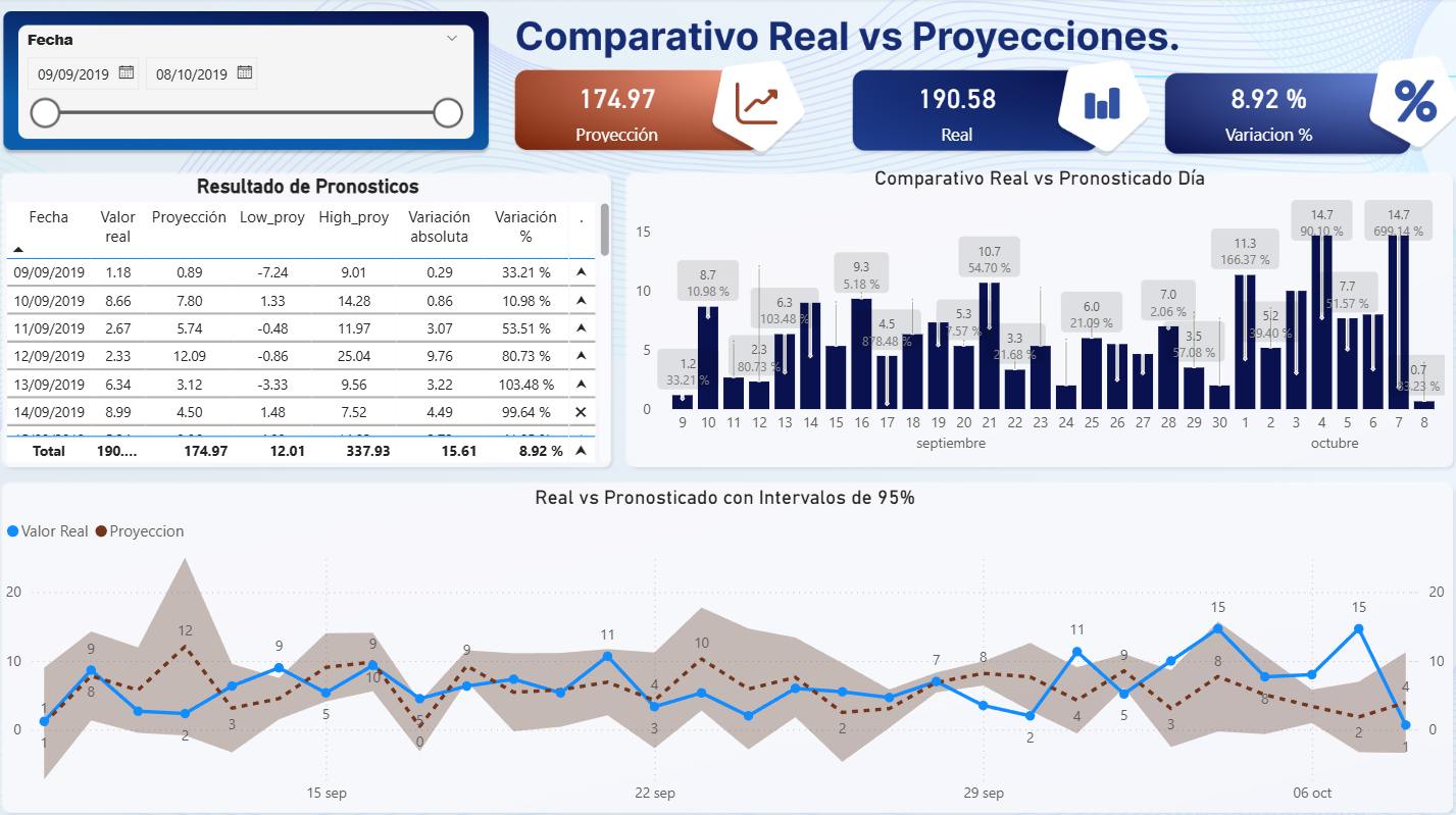 Dashboard financiero en Power BI para el análisis diario de proyecciones económicas, comparando valores reales frente a proyecciones estimadas. El panel incluye intervalos de tiempo configurables y muestra la variación entre ambos escenarios, permitiendo identificar desviaciones y tendencias.