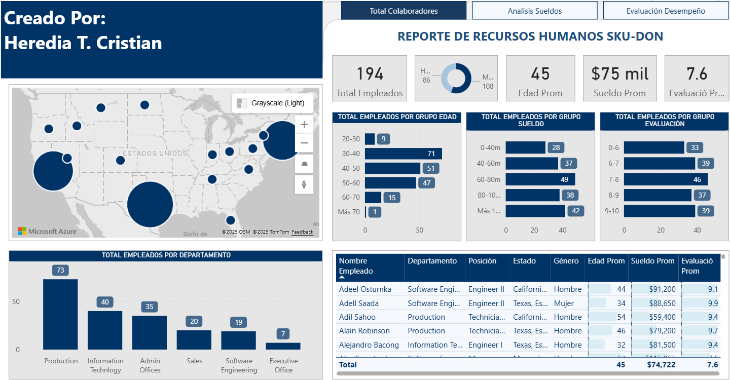 Dashboard de Recursos Humanos en Power BI para la evaluación de desempeño y análisis de sueldos. El reporte integra información clave sobre la fuerza laboral, incluyendo el total de empleados por departamento y métricas comparativas de rendimiento.