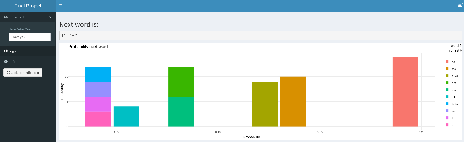 Aplicación Web dinámica desarrollada con R(shiny) que predice la palabra que vendra después, basándose en el contexto de tu frase. En inglés.