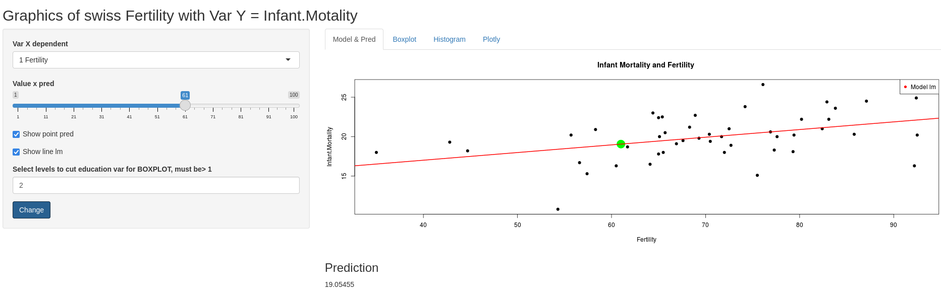 Aplicación Web dinámica desarrollada con R(shiny) para modelar el dataset de Swiss, sobre la fertilidad y indicadores socioeconomicos.