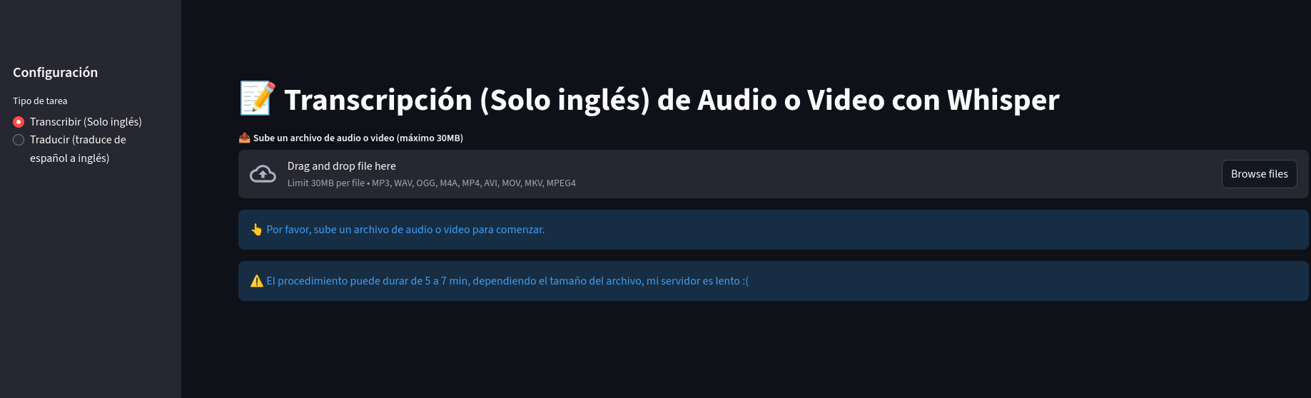 Aplicación Web desarrollado con Pytorch/Whisper, que transcribe videos/audios en inglés.